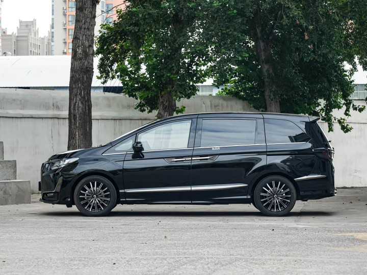 再来看车身侧面部分,4951mm车长与2900mm轴距保持现款水准,侧面采用双腰线设计,上部镀铬饰条从A柱延伸至D柱形成悬浮式车顶效果。黑爵士版专属的18英寸熏黑轮毂搭配235/50 R18轮胎,轮拱与侧裙处隆起的筋线强化肌肉感。双侧电动滑门轨道隐藏于B柱黑色饰板内,开闭噪音控制很好,但车漆厚度仍存在轻微剐蹭露底的隐患。车身尺寸方面,新车长宽高分别为4951/1842/1711毫米,和旧款车型一致。